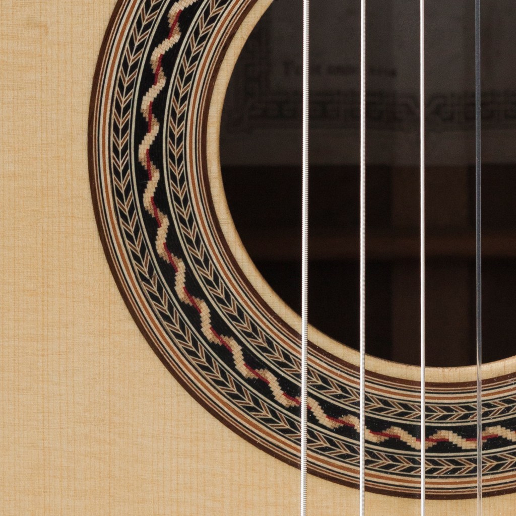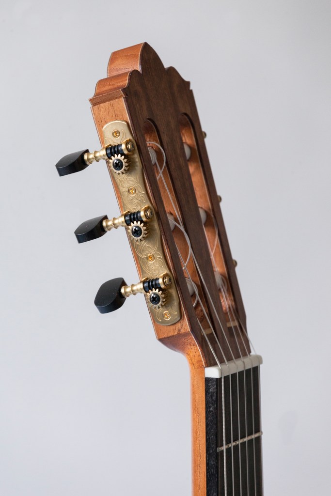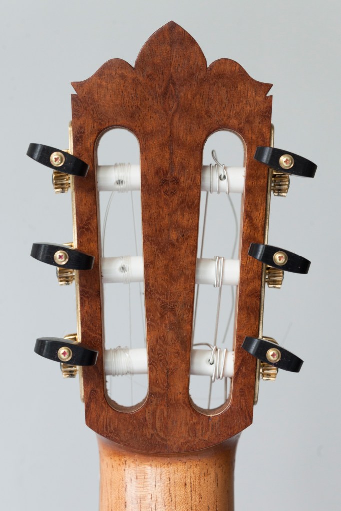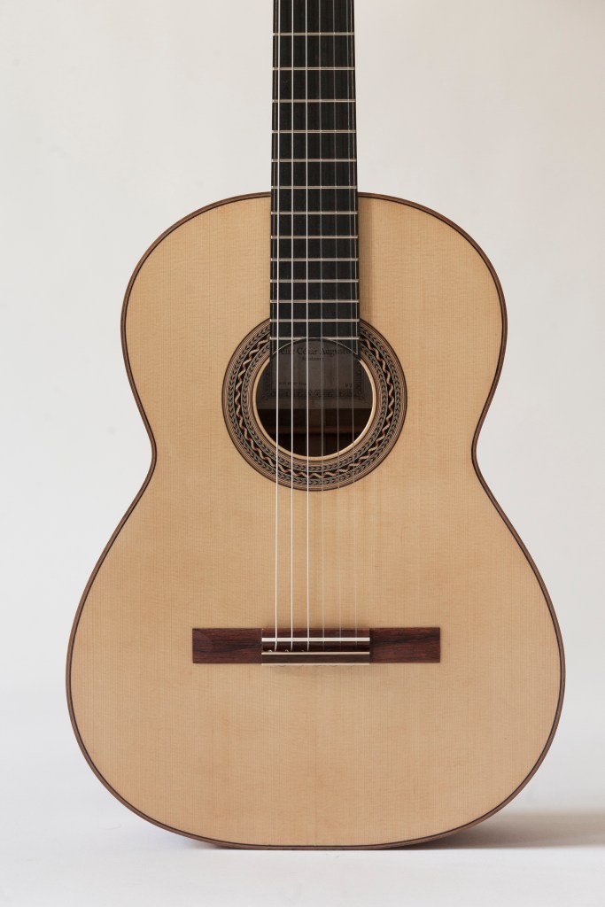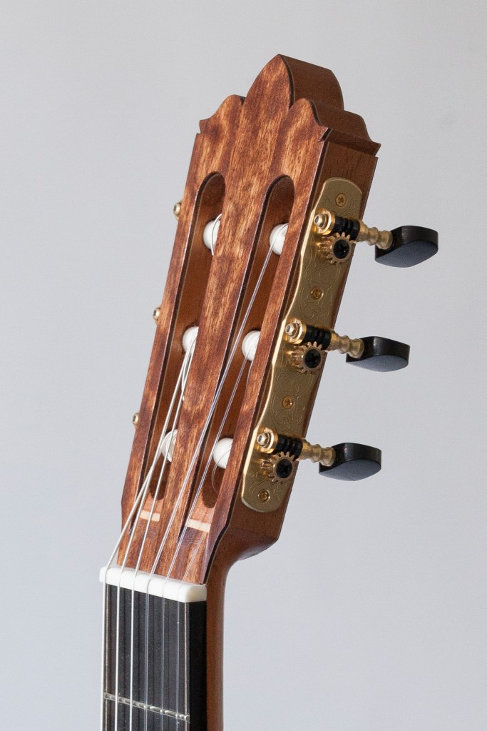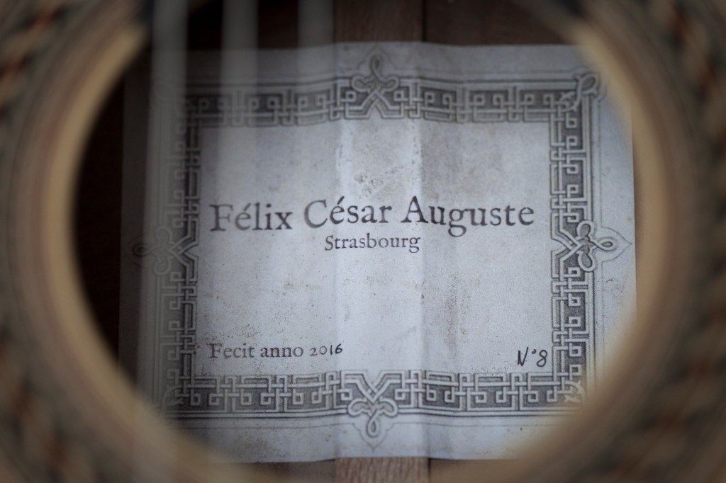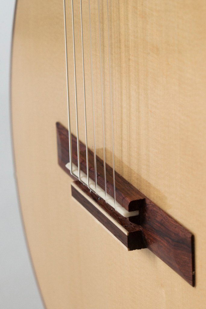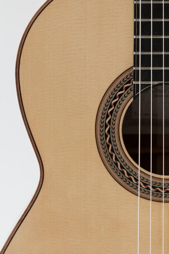 Modèle de concert, dessin extérieur et barrages personnels, développé à partir de l’étude de guitares de luthier (notamment Bouchet et Friederich), puis affiné d’instruments en instruments.